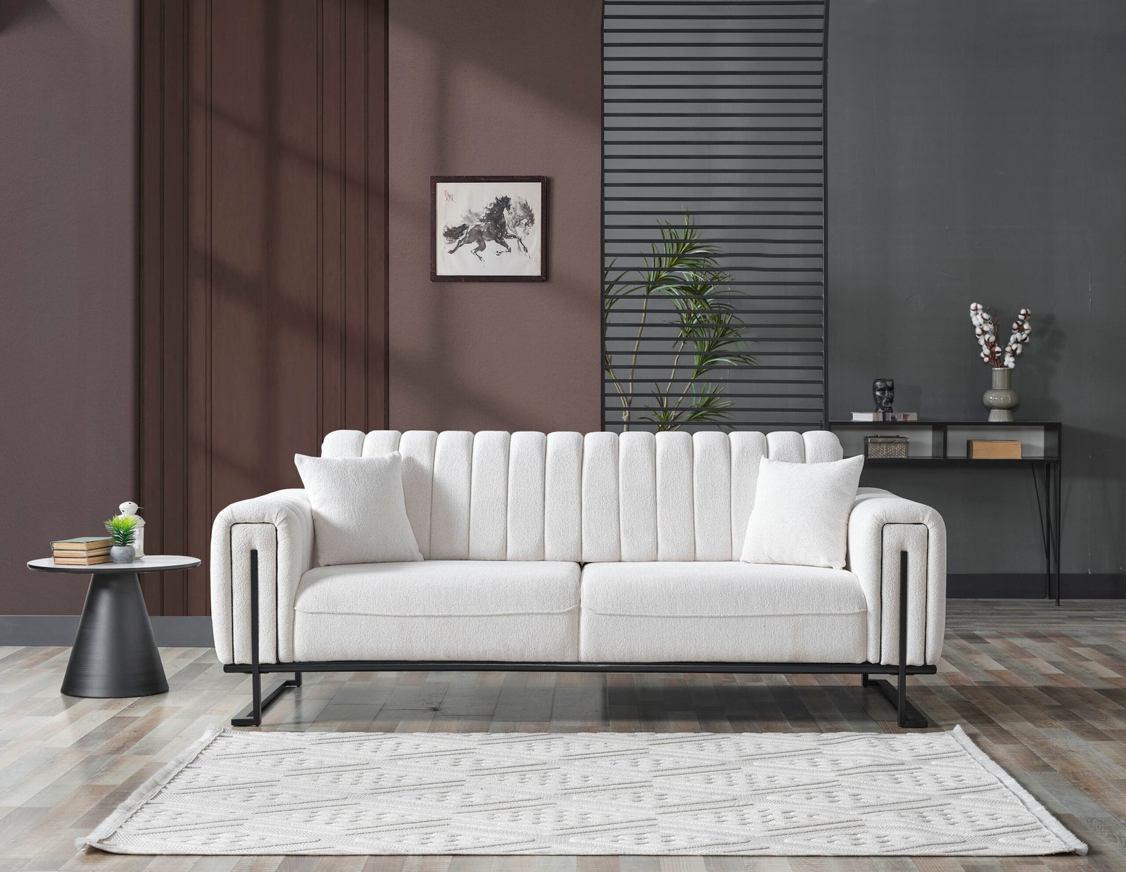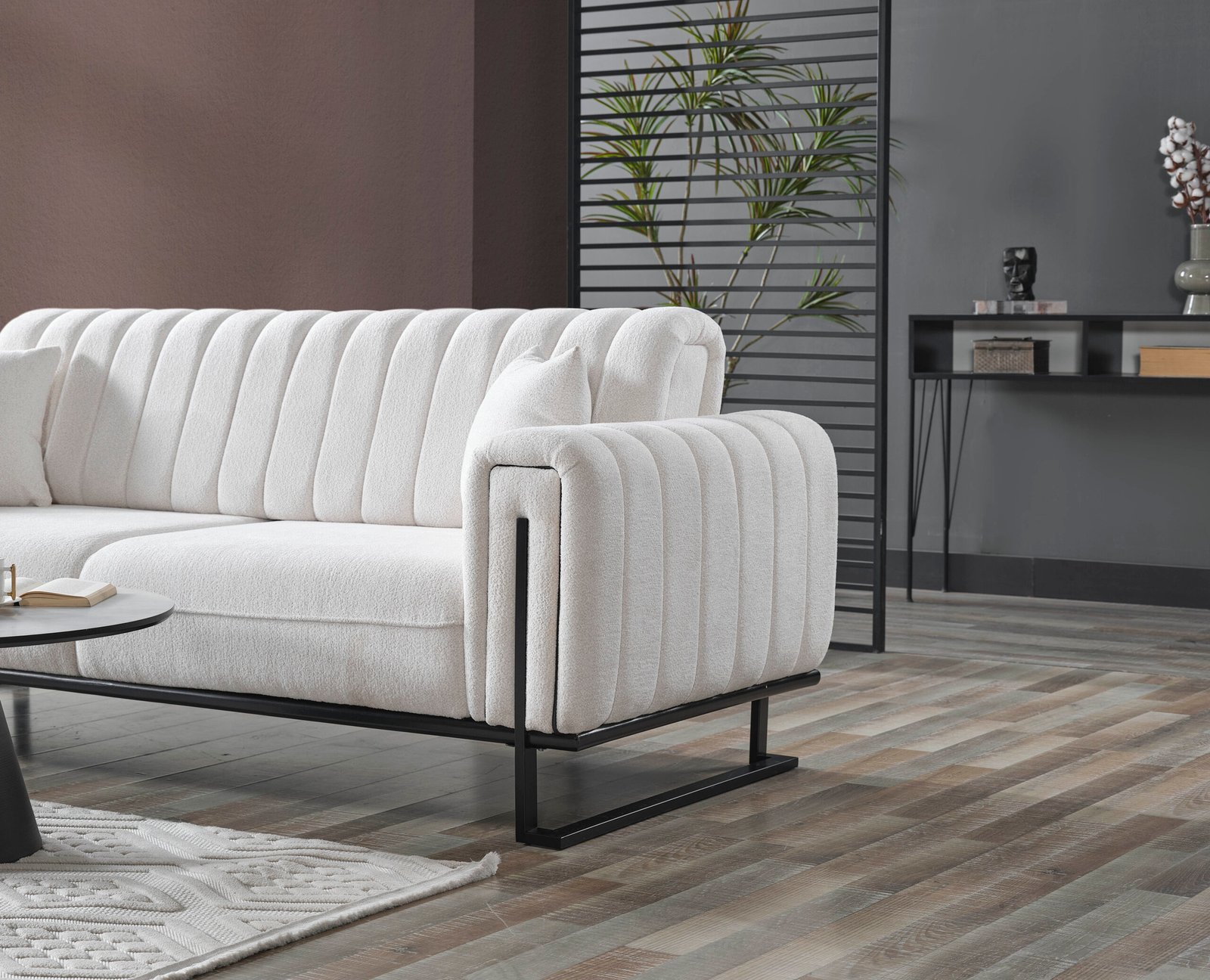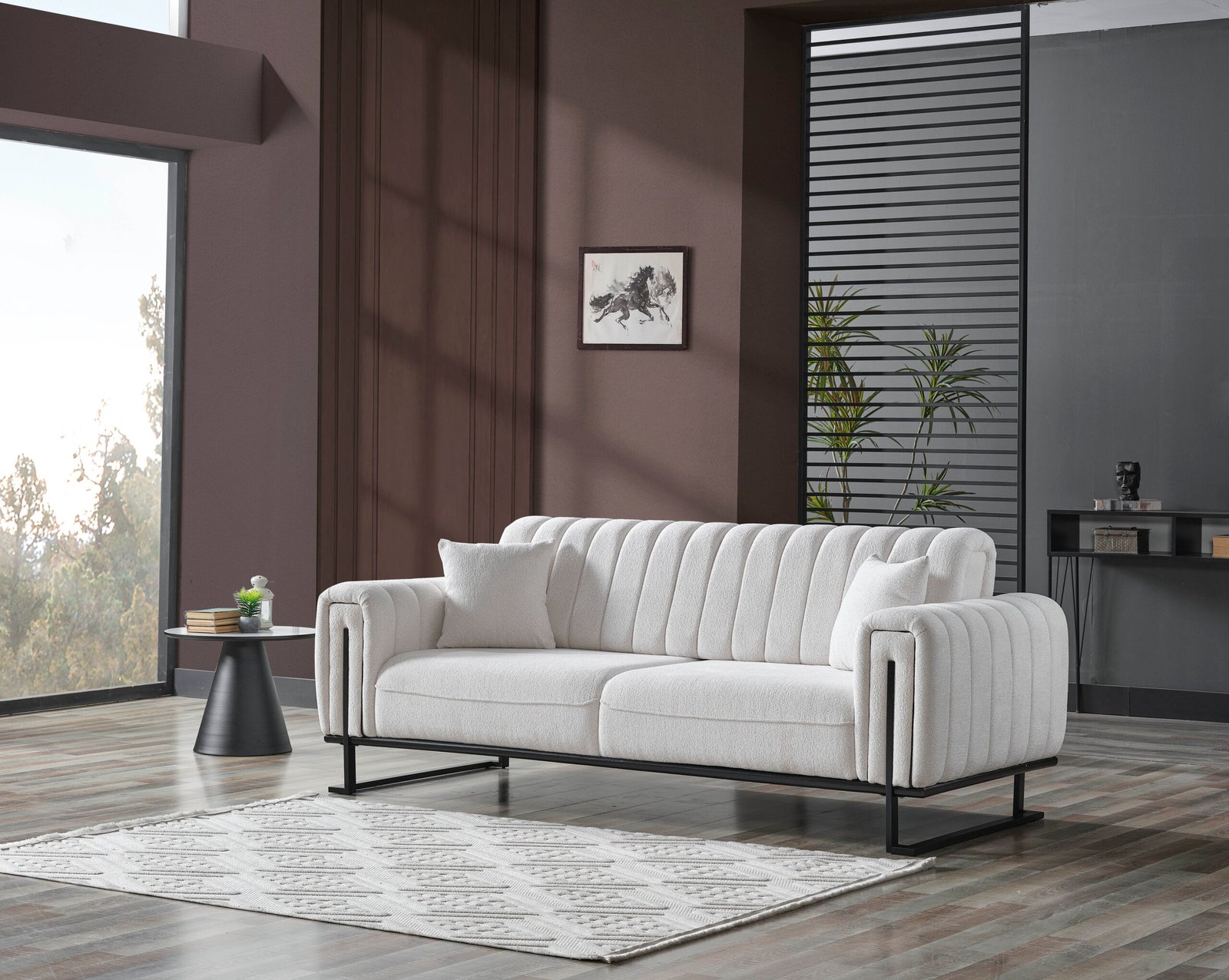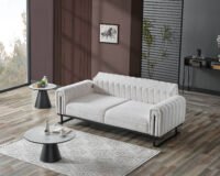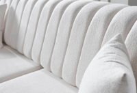 Луксозен триместен диван Stella, който е истинско визуално изявление. Отличава се с иновативна вертикално сегментирана облегалка и подлакътници, тапицирани с висококачествена бяла дамаска тип „букле“. Моделът е поставен върху минималистична черна метална рамка, която обгръща страните му, създавайки перфектен контраст и архитектурно усещане. Идеален за съвременни интериори, търсещи уникалност и висок стил.