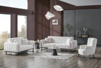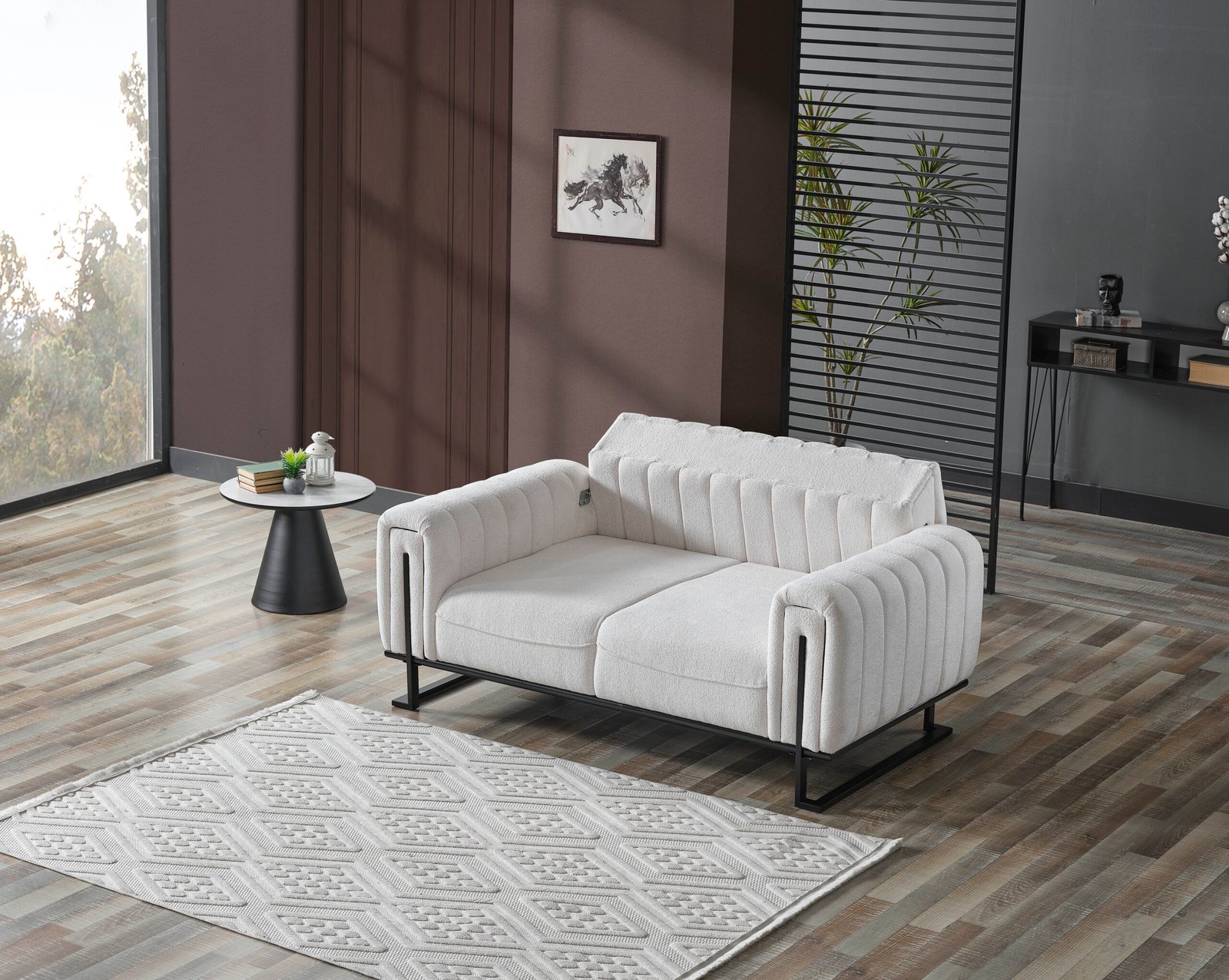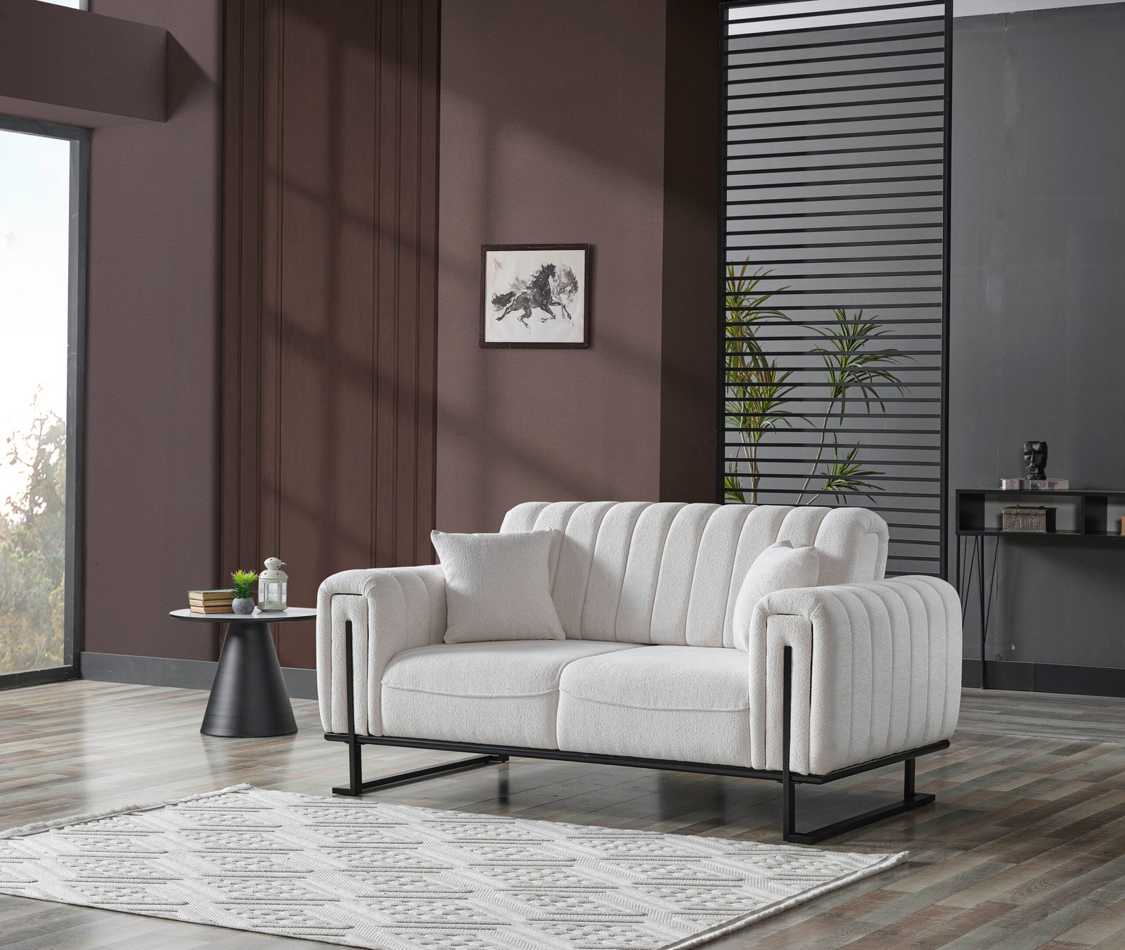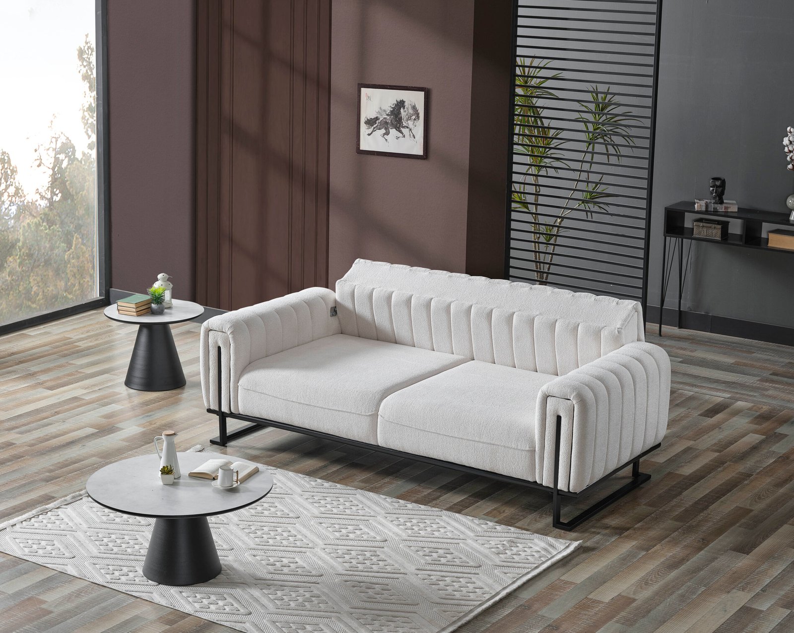 Луксозен триместен диван Stella, който е истинско визуално изявление. Отличава се с иновативна вертикално сегментирана облегалка и подлакътници, тапицирани с висококачествена бяла дамаска тип „букле“. Моделът е поставен върху минималистична черна метална рамка, която обгръща страните му, създавайки перфектен контраст и архитектурно усещане. Идеален за съвременни интериори, търсещи уникалност и висок стил.