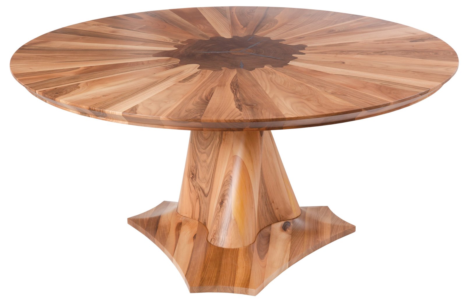 „Ръчно изработена кръгла маса от селектиран масив. Плотът е с радиална подредба на дървесните шарки, а основата е монолитна и артистична, гарантираща стабилност и неповторимо визуално присъствие.“