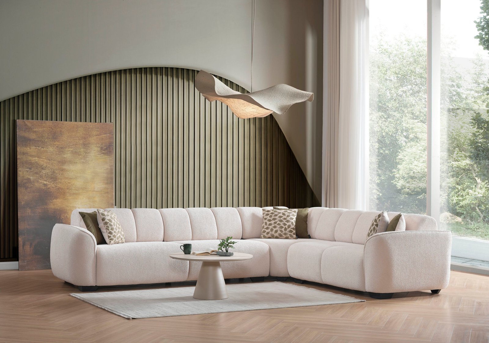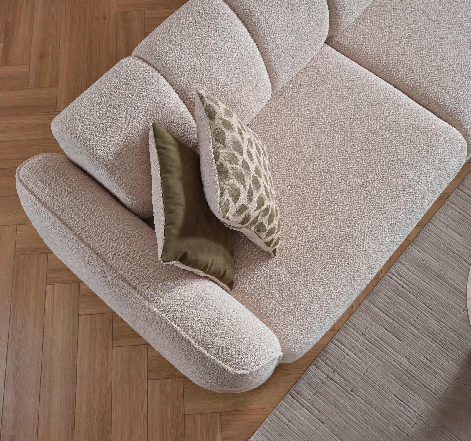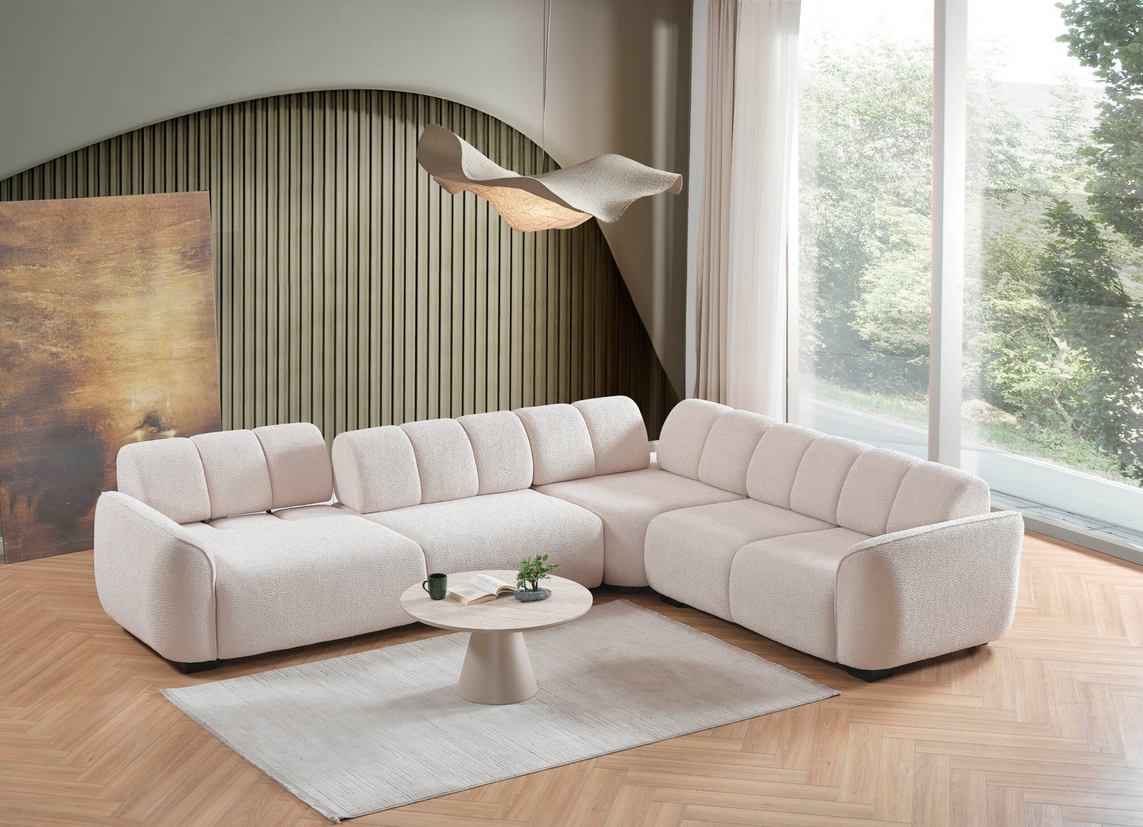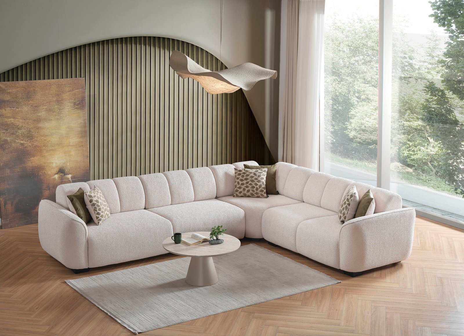 Монументален ъглов диван от серията Forliva, съчетаващ органичен дизайн и изключителна мекота. Отличава се с характерната си „букле“ текстура и сегментирана облегалка с вградени механизми за регулиране на комфорта. Просторната ъглова конфигурация го прави идеален за големи дневни, търсещи модерен акцент и уют