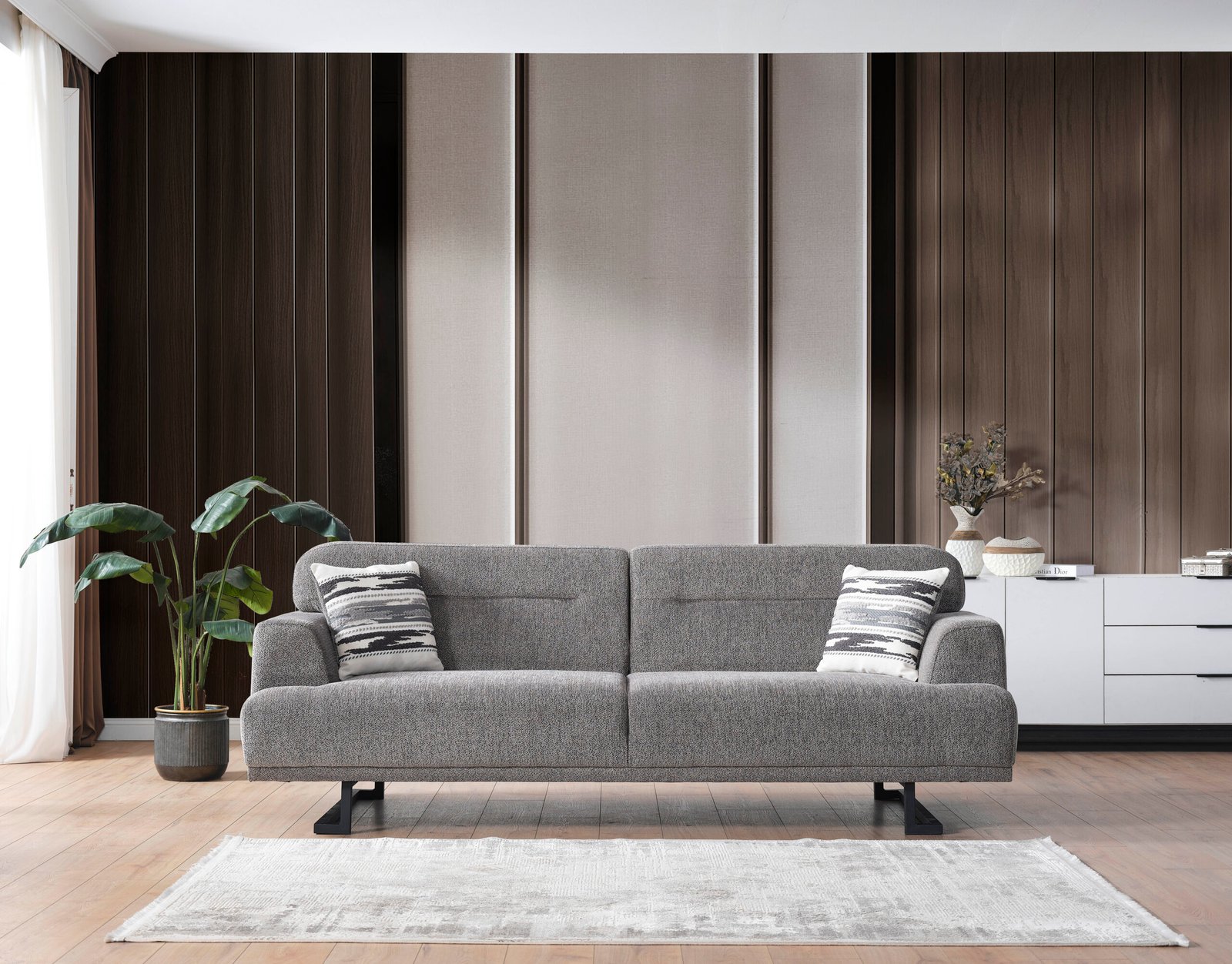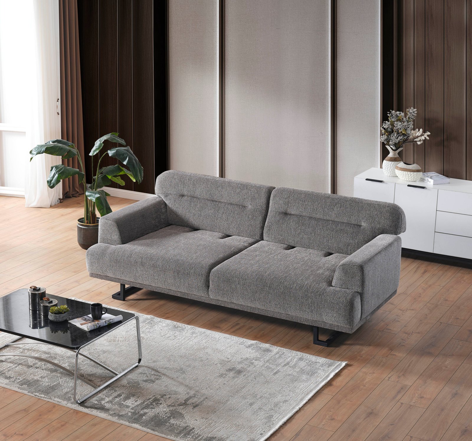 Диванът Lora е създаден с внимание към детайла, предоставяйки изключителна устойчивост и дълготрайност. Висококачествените материали, от които е изработен, са предназначени да устоят на ежедневното износване, като същевременно предлагат изключителен комфорт. Текстурираното сиво покритие е лесно за почистване и поддръжка, което го прави подходящ за семейства и професионални среди. Изчистените линии и минималистичният профил на модела създават атмосфера на съвременност и уют.