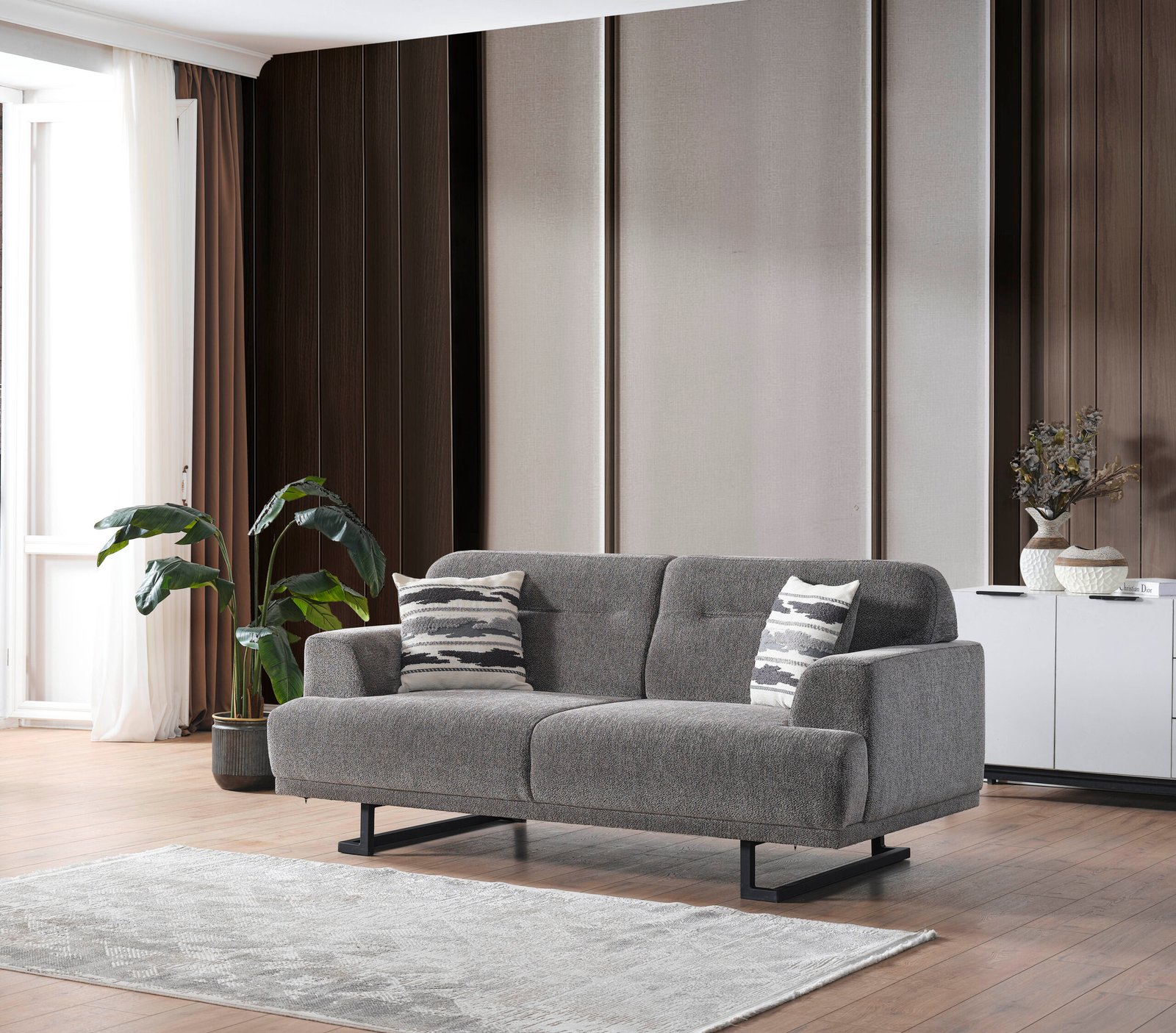 Стилен двуместен диван модел Lora, проектиран с мисъл за съвременния градски дом. Отличава се с изискана дамаска в меланжирано сиво, която придава дълбочина на интериора. Високите черни метални крачета осигуряват визуална лекота и лесен достъп за почистване, докато меките облегалки предлагат оптимален комфорт. Перфектен баланс между минимализъм и уют.