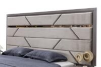 Модерен спален комплект с изчистен дизайн, мраморен ефект и златисти акценти. Включва гардероб, легло с тапицирана табла, скрин с огледало и две нощни шкафчета.