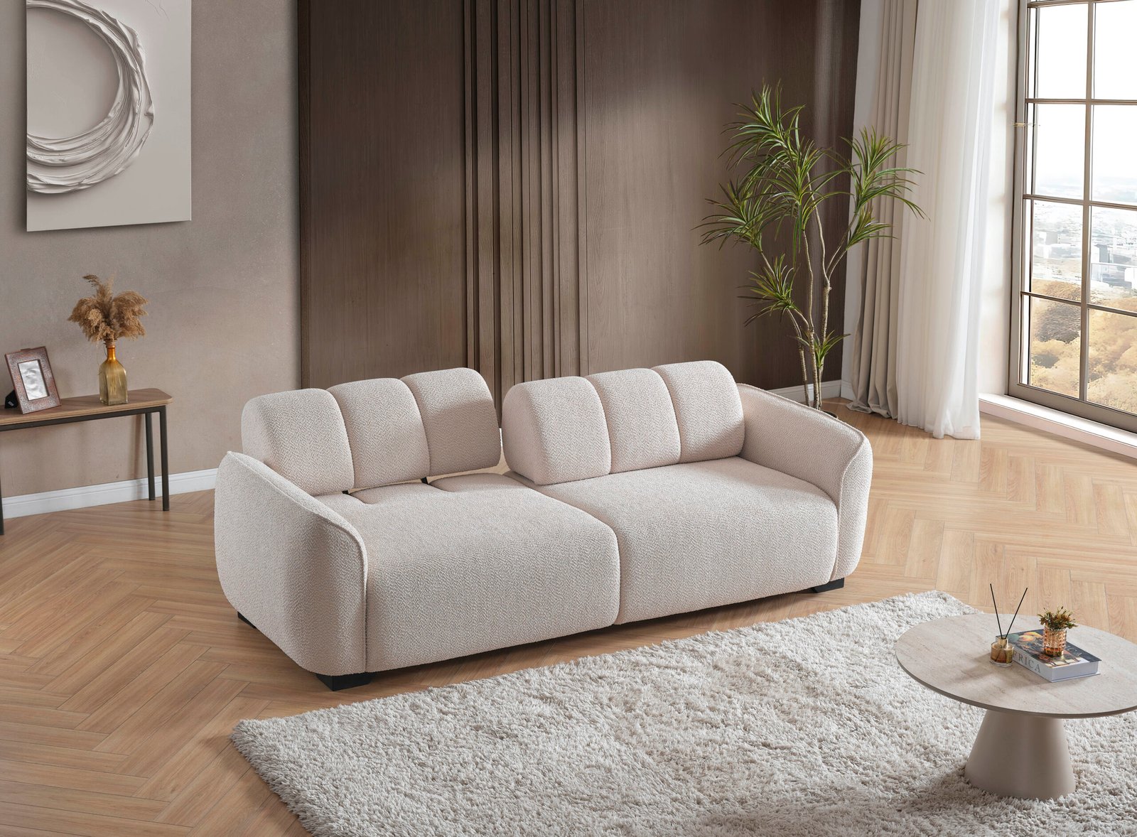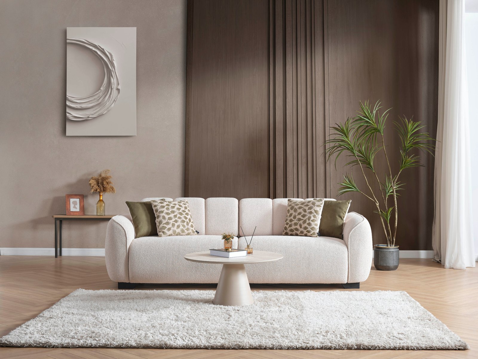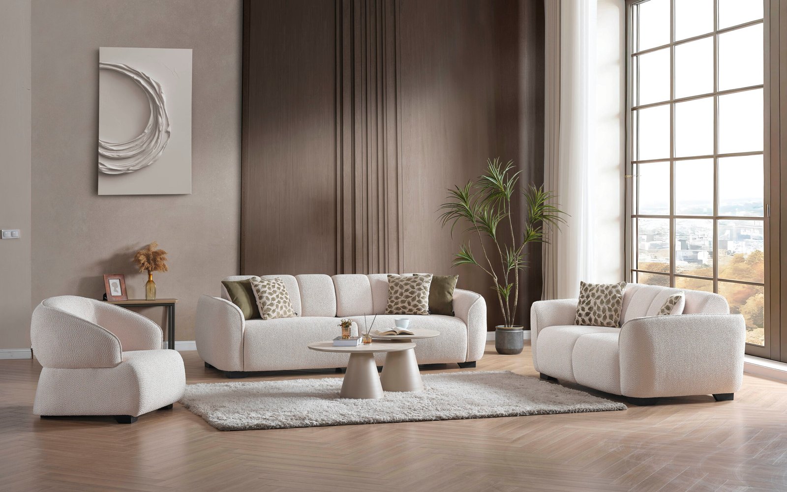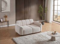 Елегантна серия мека мебел Forliva, отличаваща се с изключителен комфорт и модерна естетика. Изработена с висококачествена дамаска тип „букле“ (bouclé), която придава богата текстура и мекота. Дизайнът залага на плавни, заоблени линии и сегментирана облегалка, вдъхновени от съвременния минимализъм. Серията включва триместен диван, двуместен диван и фотьойл, подходящи за изискани дневни пространства