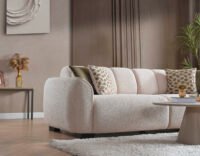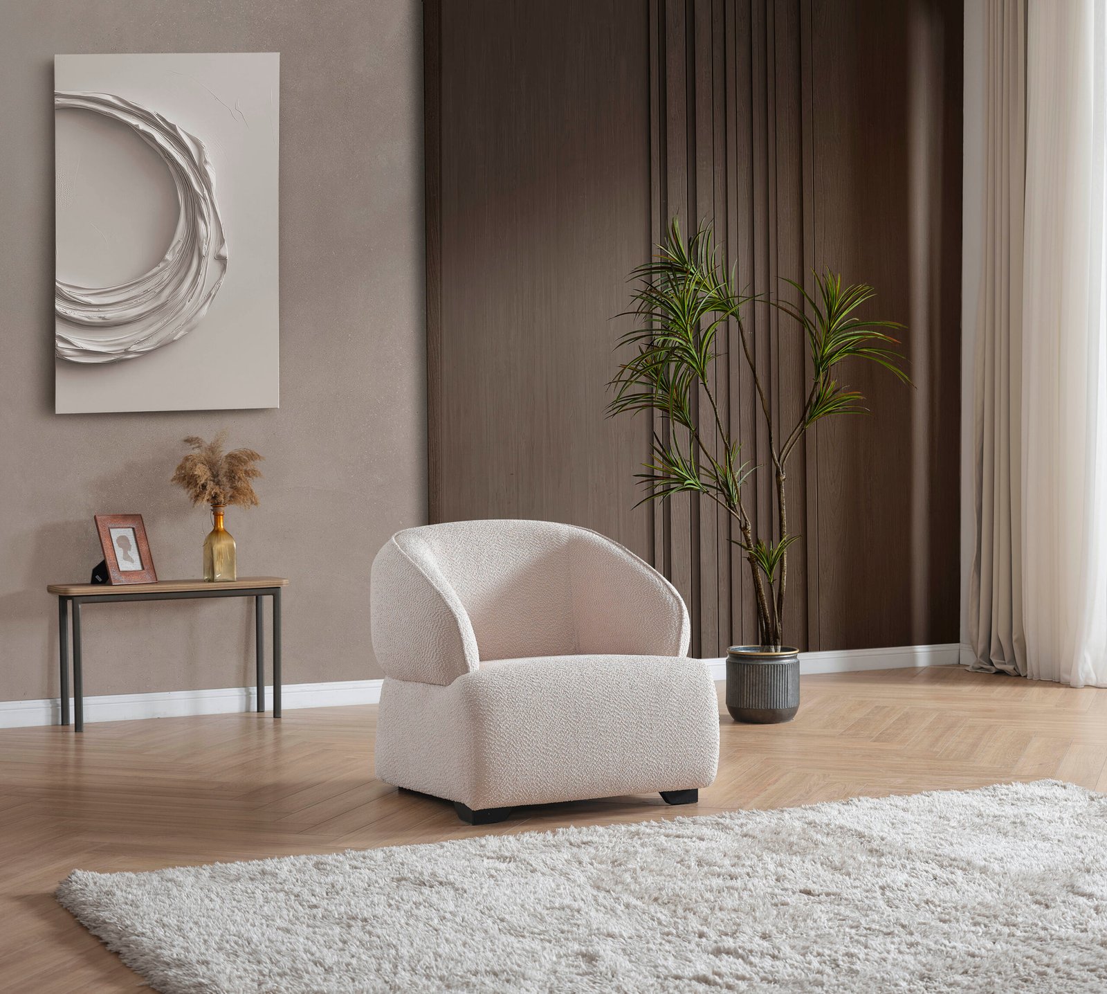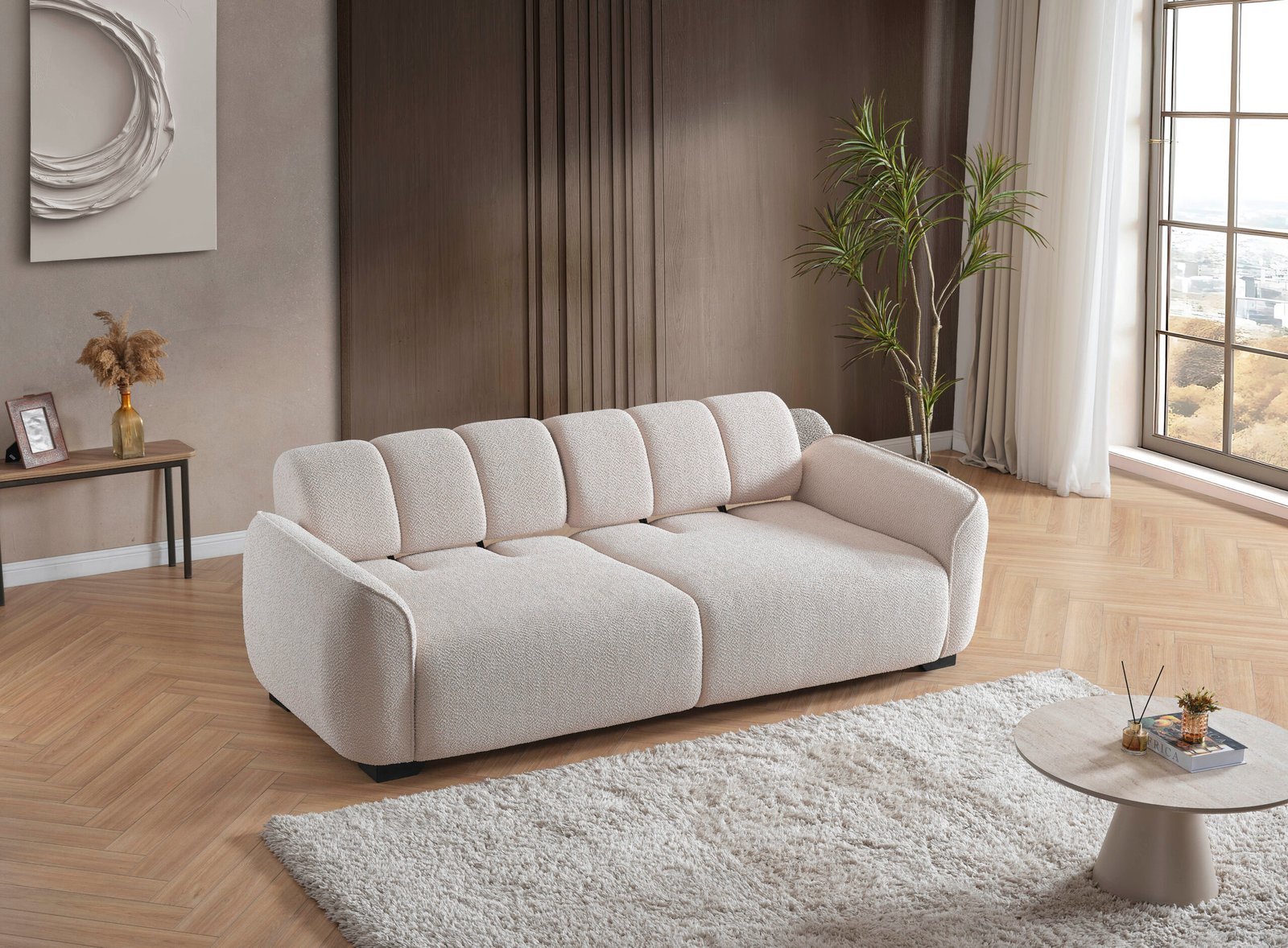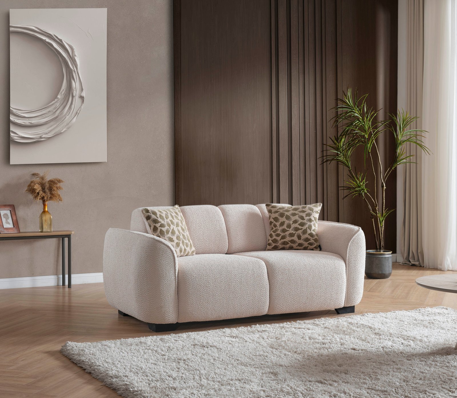 Елегантна серия мека мебел Forliva, отличаваща се с изключителен комфорт и модерна естетика. Изработена с висококачествена дамаска тип „букле“ (bouclé), която придава богата текстура и мекота. Дизайнът залага на плавни, заоблени линии и сегментирана облегалка, вдъхновени от съвременния минимализъм. Серията включва триместен диван, двуместен диван и фотьойл, подходящи за изискани дневни пространства